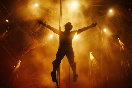 Silhouette of a trapeze artist performing under warm stage lights with fog effects