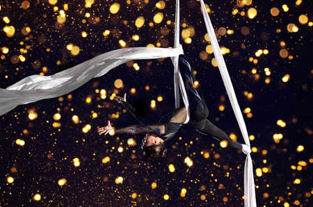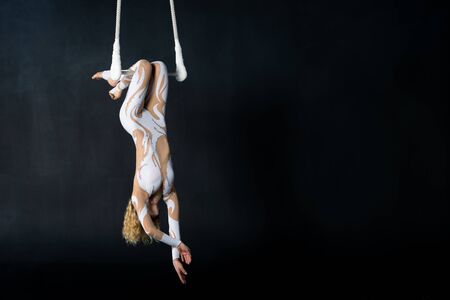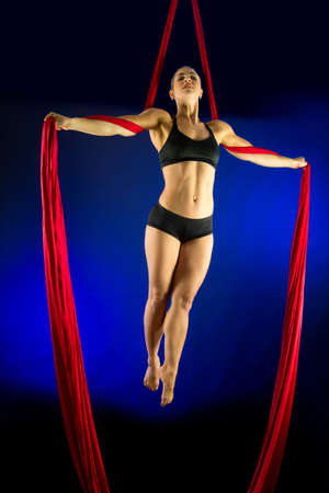 Young woman circus air gymnast. On black background