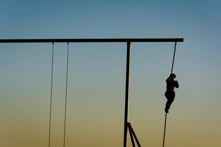 Man climbing a rope, at Muscle Beach, in Santa Monica, California.