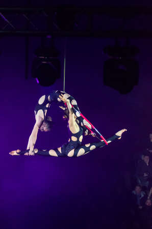 DNIPRO, UKRAINE - DECEMBER 13, 2019: Aerial gymnasts on the ring Rumyantsev Anna and Eriomin Anastasia perform at the Circus.