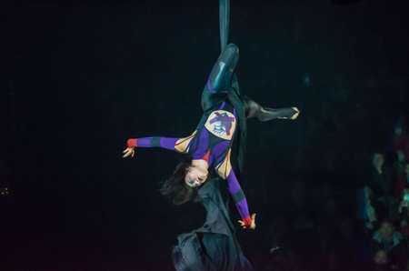 DNIPRO, UKRAINE - DECEMBER 13, 2019: Elizabeth Horela performs Aerial gymnastics on canvases at the Circus.