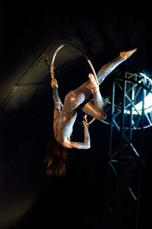 Female acrobat while presenting the show in the air on the hoop.