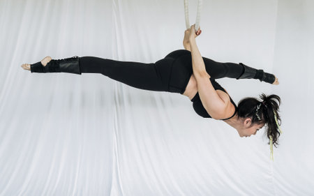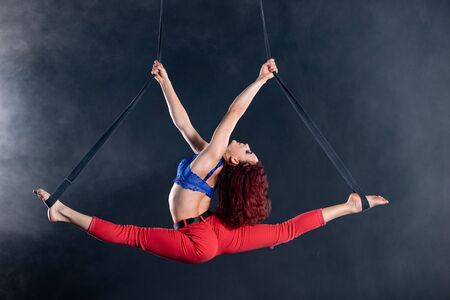 Female athletic, sexy and flexible aerial circus artist with redhead on aerial straps on black background