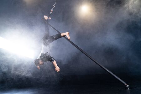 Performance concept. Man hanging on chinese pole. Athlete performing flying pole