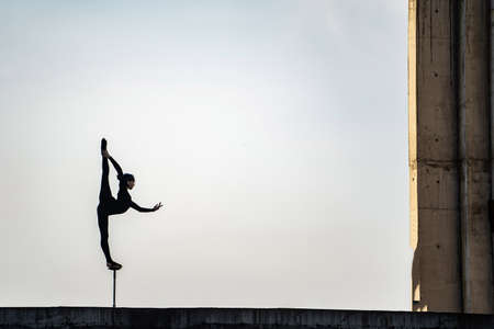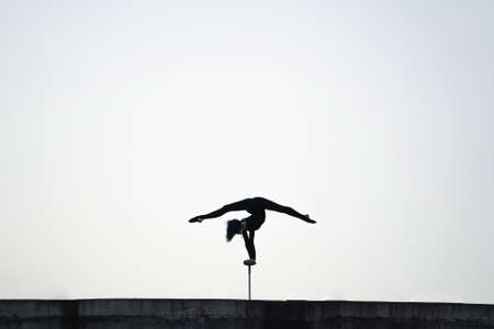 Silhouette of flexible girl keeping balance in split on sky background. Concept of individuality, creativity and outstanding