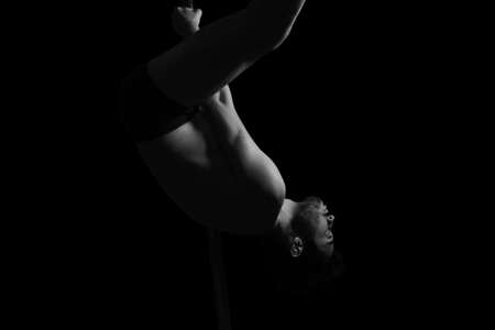 Dramatic dark portrait of a young man pole dancing. Dark background studio shot. Black and white image.