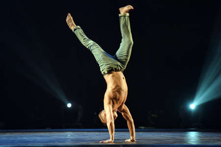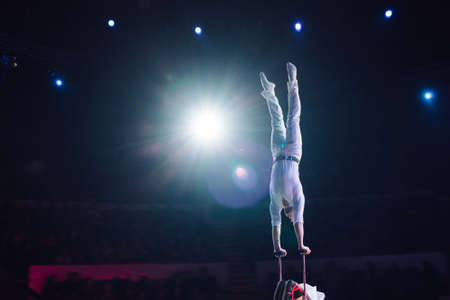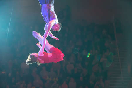 Belarus, Gomel, April 1, 2018. Gomel State Circus. Performance of the team of the Moscow circus Nikulin.A dangerous acrobatic number in the circus of a pair of gymnasts without support.
