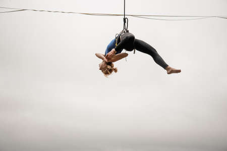 Female athletic, sexy and flexible aerial circus artist with redhead dancing in the air on the silk