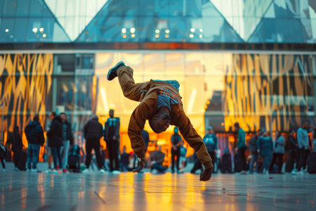 a breakdancer performing in a bustling city square