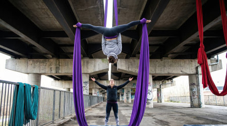 An aerialist hangs upside down in a split on purple silks under a bridge while her partner watches from below. An urban setting for a display of strength and grace.
