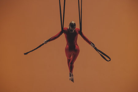 Female aerial gymnast on orange background of studio. Girl circus performer in red jumpsuit performing acrobatic element with straps hanging at height.