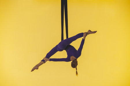 Female gymnast isolated on yellow studio background. Girl aerial dancer spinning on gymnastic straps, showing acrobatic elements.