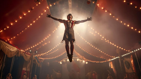 A skilled male acrobat in a red shirt carefully walks a tightrope, using a long pole for balance under the bright colorful lights of a circus tent with an audience below.