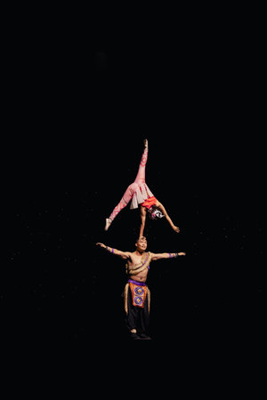 A pair of acrobats perform acrobatic elements on a black background