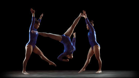Young woman gymnast. On black background with flash effect.