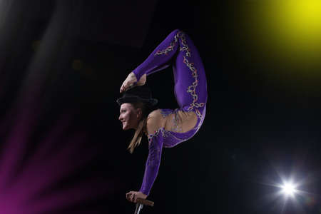 Circus actress performs the number in a beautiful smoke. Manual equilibrium on canes. Flexible girl body.Performance of an air gymnast in a circus