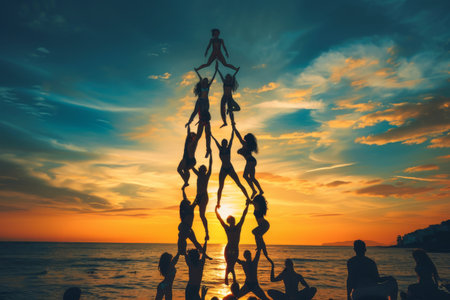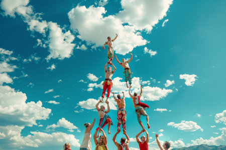 Acrobats forming a human pyramid, reaching towards the sky --ar 3:2 Job ID: 7ae8f9fb-d0f2-4f51-8319-b56e0734dd85