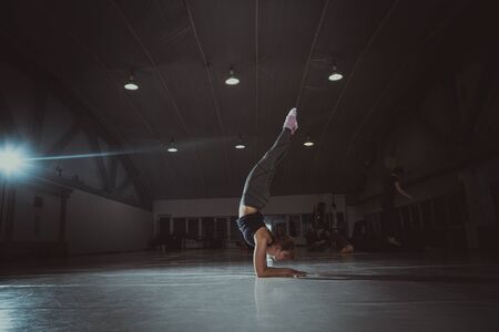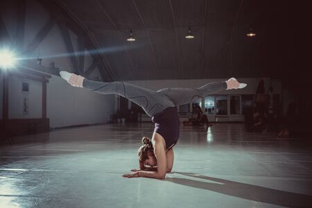 Flexible girl doing stretching and handstand in studio. concept of healthy lifestyle and yoga