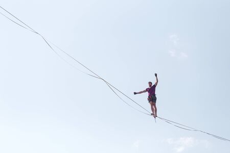 Highliner on the background of blue sky makes a move. A man is walking along a stretched sling. Performance tightrope walker. Man balances over the abyss. A decisive step forward.