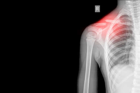 Right Shoulder Xray AP views Showing fracture middle cavicle on red mark,Medical image concept. and coppy space.