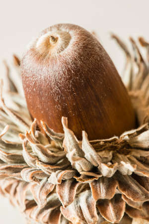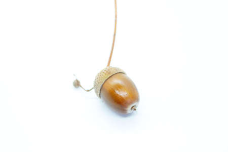 An old dry acorn. Isolated on white background. Close up. Selective focus