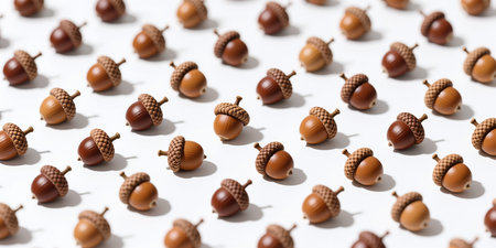 A repeating pattern of realistic brown and tan acorns with textured caps and stems on a white background.