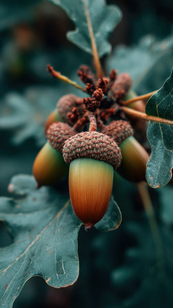 A close-up view of several acorns grouped together on an oak tree branch, surrounded by green and brown leaves in a serene outdoor environment.