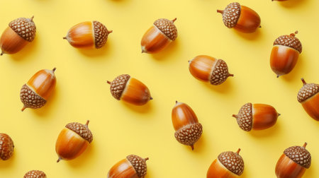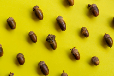 Flat lay of oak acorns. Pastel yellow background. Trendy pattern with shadows. Aesthetic natural concept. Generative AI.