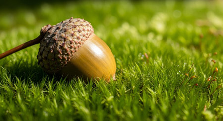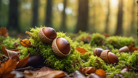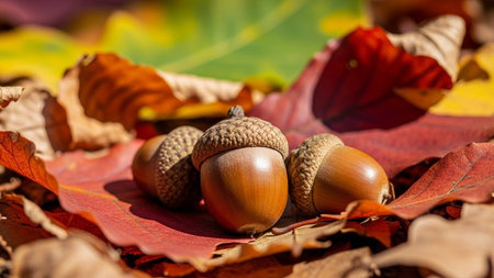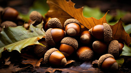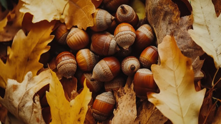 Vibrant acorns rest among a bed of crisp, fallen leaves, capturing the rich, earthy essence of the autumn season.