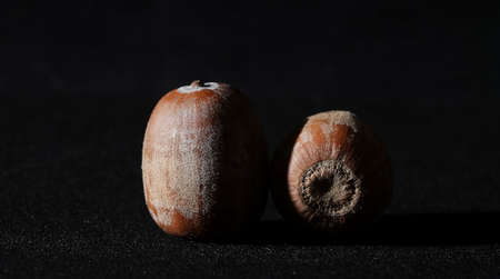 Two whole hazelnuts rest on a dark, textured surface, highlighting their distinct shape and ribbed shell. The image evokes a sense of simplicity and natural elegance.