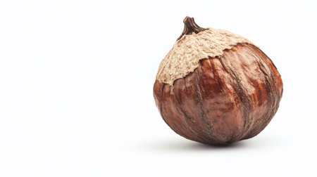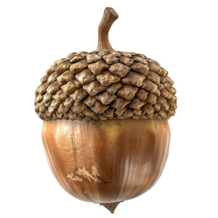 Realistic acorn with dark stem against a plain white background in a very clean, highly detailed macro-style image exhibiting subtle shadowing and warm, earthy tones.