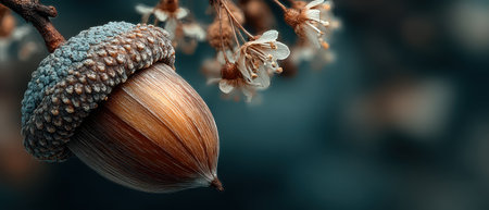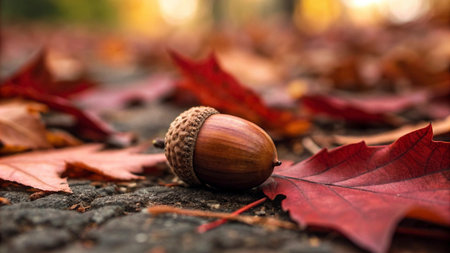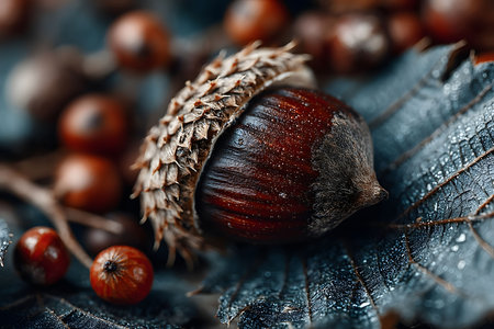 Close-up of an acorn nestled amidst an arrangement of fallen leaves and small red berries, showcasing the rich textures and earthy tones typical of autumn. this composition highlights nature's intricate details and seasonal beauty. Generative AI