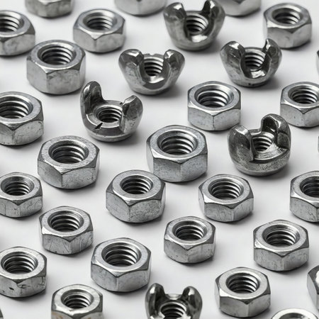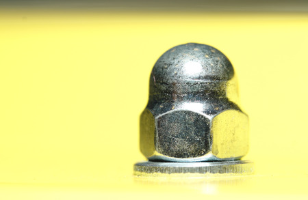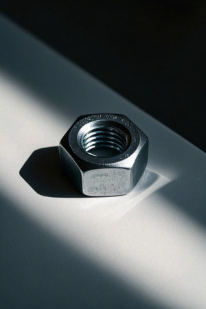 This close-up image features a metallic nut reflecting light with a glow effect in the background. The intricate details and textures are highlighted, making it ideal for industrial themes.