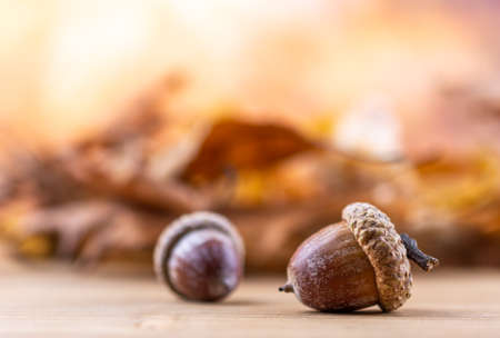 Two acorns on a wooden table. Autumn fallen leaves in the background. Autumn background.