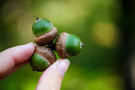 Three beautiful green acorns in hand on green background. Copy space, clothe-up.