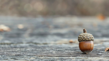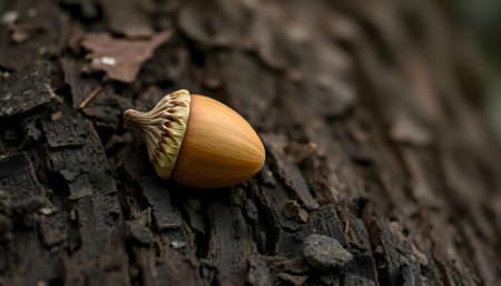 A detailed focus on a solitary acorn lying on a textured rocky ground, highlighting its natural earthy tones and textures, perfect for themes of nature and autumn.