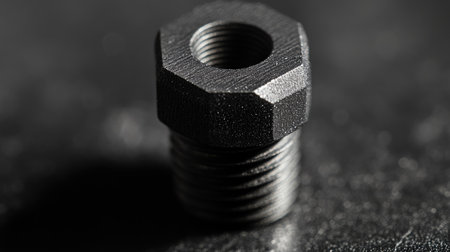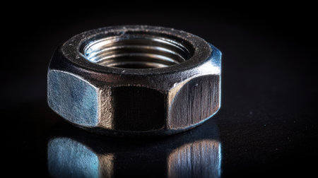 This close-up image features a metallic nut resting on a dark surface, showcasing intricate details and reflections that highlight its craftsmanship.