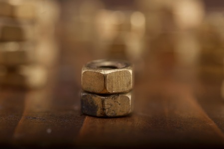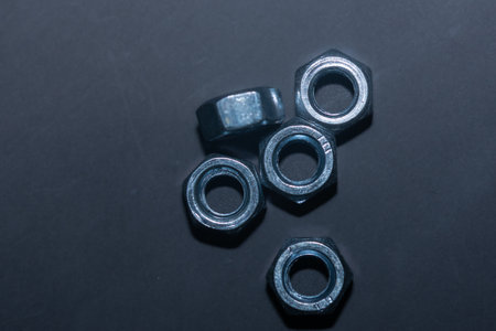 Metallic nuts. Low-key concept picture taken in studio with soft-box and dark background representing some mechanical components.