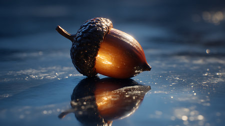 An acorn with a frosty cap lies on a chilled surface. The surrounding ice crystals glimmer softly, highlighting the beauty of winter. Nature's details are captured in this serene moment.