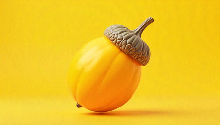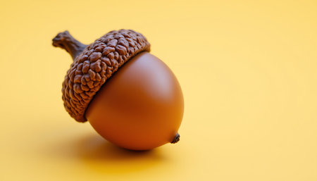 a beautiful autumn acorn isolated on a bright yellow background, its rich brown shell and textured cap rendered with crisp detail. the acorn's glossy surface reflects soft light, with subtle oak leaf accents adding a natural touch. the vibrant yellow backdrop creates a cheerful, seasonal contrast, perfect for autumn, nature, or rustic themed visuals