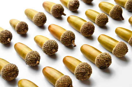 Ripe yellowed dry acorns collected in autumn, ripe oak seed, isolated on white background