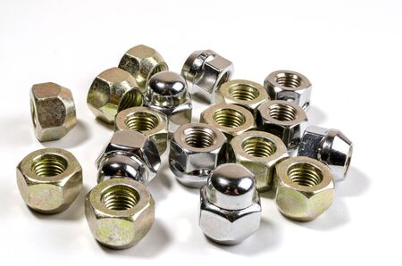 close-up on a white background a lot of different new nuts and bolts for car wheels