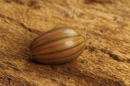 A detailed macro photograph of a single, perfect acorn with a textured cap and smooth, brown nut. The image is set against a soft, neutral background, highlighting the natural beauty and detail of the oak seed.
