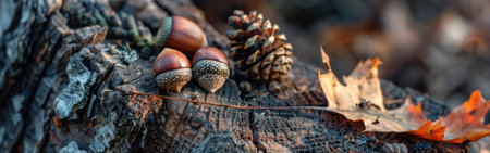 Three acorns and a pine cone rest on a fallen log covered in rough bark. The acorns are brown with ridges and caps. The pine cone is a light brown and has a rough texture. A withered leaf lies near the acorns, partially obscuring the pine cone.