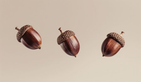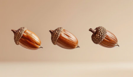 Three acorns floating against a soft beige background, highlighting their glossy texture and unique shapes Elegant and minimalist composition