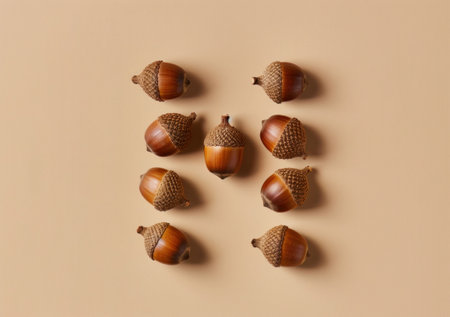 Acorns arranged in a symmetrical pattern on a soft beige background, showcasing their natural texture and color variations