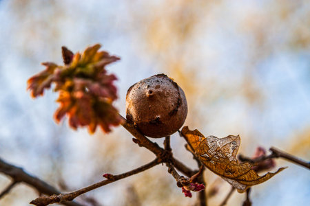 A closeup shot of a brown seed pod on the branch of a tree with autumn leaves in a forest