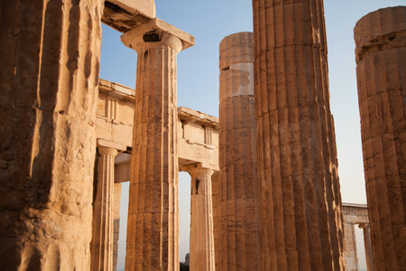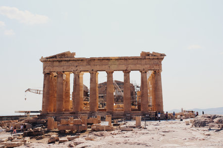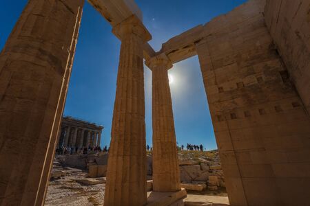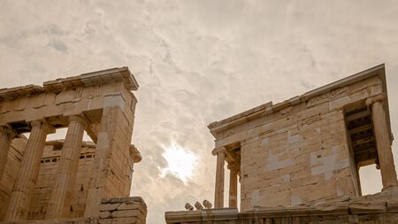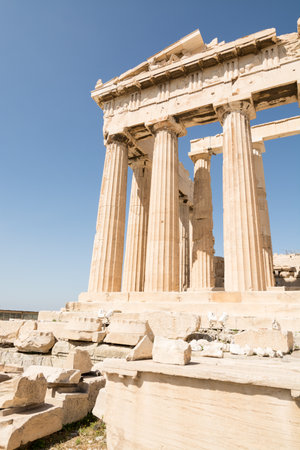 Spectacular sights of the ruins in ancient Greek Acropolis, old temple of parthenon and stone pillar columns
