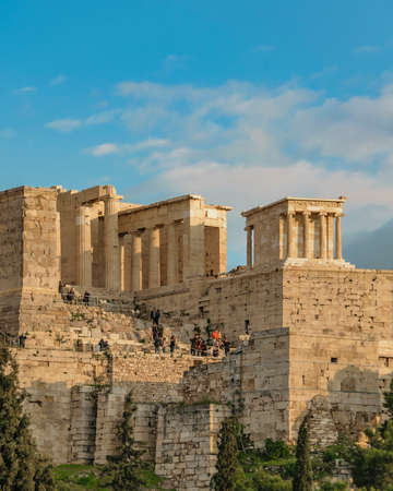 Ancient Greek ruins of Propylaea on a top of Acropolis hill in Athens. Acropolis - main tourist attraction of Athens. Greece