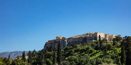 Acropolis in Athens, Greece. View of the beautiful hill on which the Acropolis rises. Acropolis of Athens is the most striking and complete ancient Greek monumental complex still existing in our times